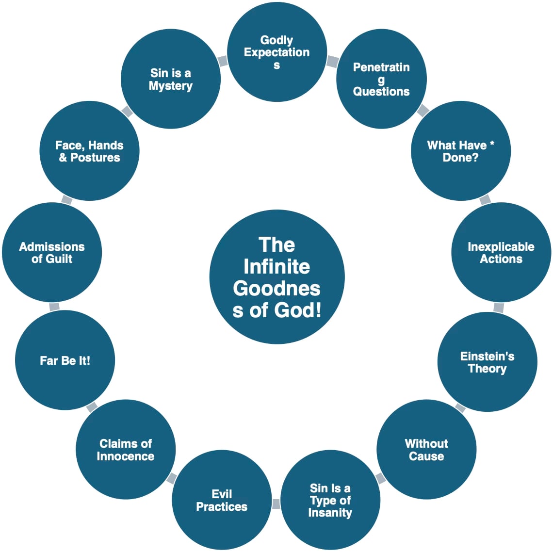 Below is a Word smart art depiction of what I now see. The various categories link together and support the infinite goodness of God. You may wish to print the smart art below so you can better follow as I attempt to unpack what I have discovered so far.